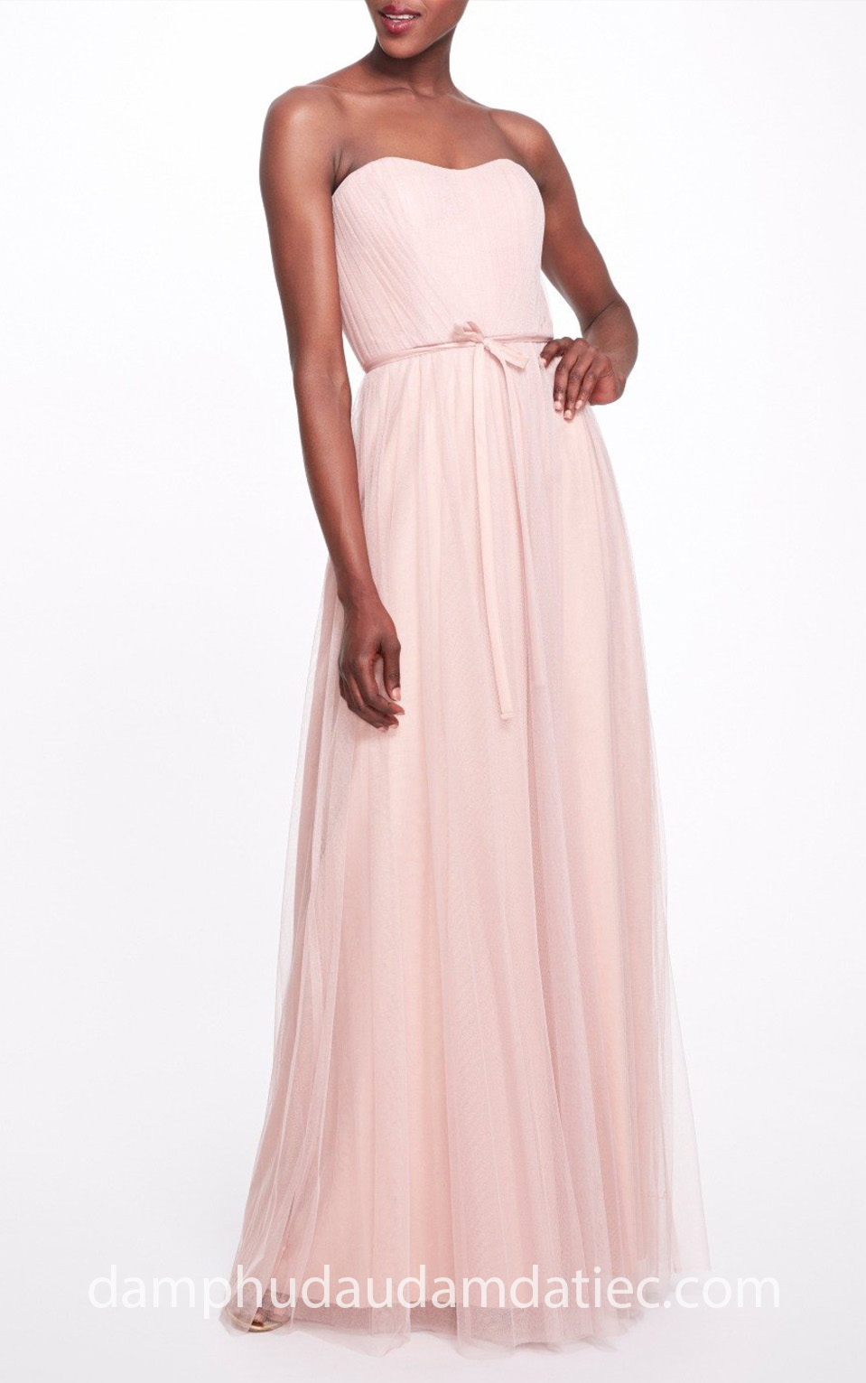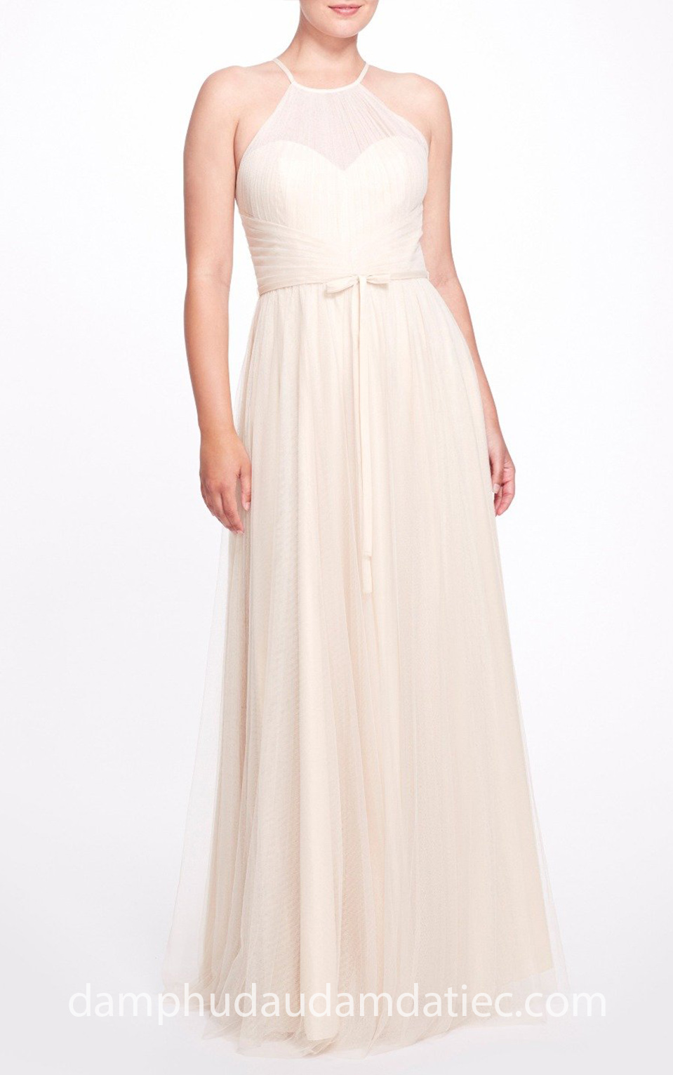 Đầm phụ dâu cổ yếm sẽ thích hợp với những bạn có phần vai thô to sẽ giúp cân đối vai, những nếp xếp tinh tế đan chéo xuống thắt nơ siết eo thon gọn, chân váy rũ nhẹ nhàng thanh lịch.