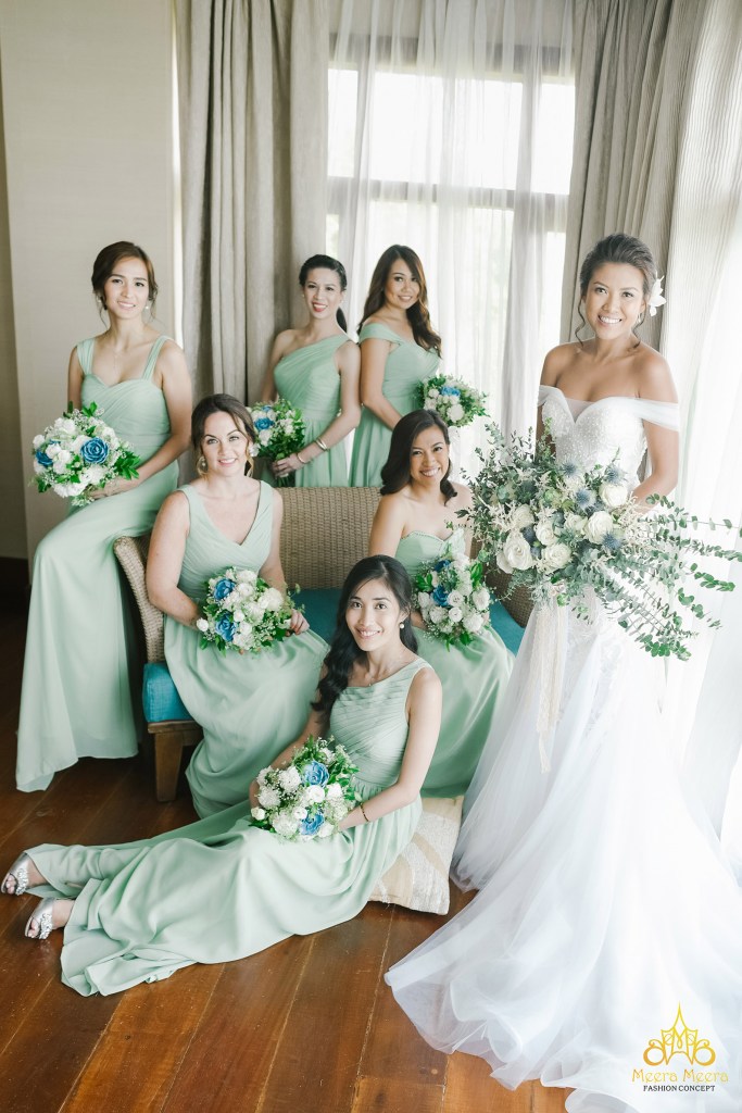 Xuất hiện ấn tượng với mẫu váy cưới đuôi cá đẹp tựa nữ thần, cô dâu Charm Flores rất tinh tế khi chọn tone màu xanh pastel cho dàn phụ dâu thân thiết của mình, vừa phù hợp không khí của vùng biển Boracay, lại vừa rất hợp chủ đề đám cưới miền nhiệt đới. Cô dâu phá cách khi trên cùng một chất liệu lại yêu cầu nhà thiết kế thay đổi kiểu dáng đầm phù dâu cho từng người chị em, đây cũng là món quà đặc biệt mà cô dâu dành riêng cho hội bạn thân thiết.