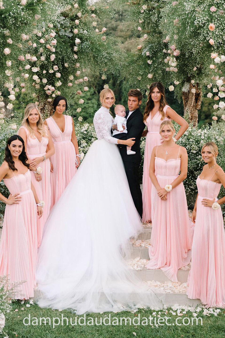 Là một cô dâu yêu thời trang, tất nhiên chúng ta không thể không nhắc đến đám cưới đình đám nhất thế giới của “chị đại” fashionista Chiara Ferragni. Gây choáng ngợp với lễ cưới vô cùng xa hoa cùng hai chiếc váy cưới “hàng thửa” được đích thân nhà mốt Dior sáng tạo đẹp như cổ tích, dàn phụ dâu cũng để lại ấn tượng không kém khi diện lên người những mẫu đầm phù dâu màu hồng lãng mạn do nhà mốt Alberta Ferretti thiết kế và may theo số đo.