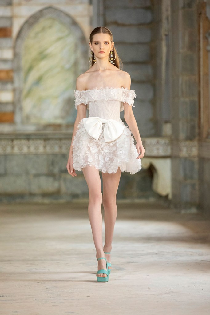 Bên cạnh đó, xu hướng cô dâu diện đầm cưới ngắn mini dress cũng lên ngôi trong mùa cưới 2022. Mẫu váy cưới ngắn mini dress thuộc BST Ready to Wear xuân hè 2022 của nhà mốt Georges Hobeika, xuất hiện ấn tượng với cổ áo trễ vai khoe trọn xương quai xanh, tùng váy đính kết hoa 3D công phu và thắt nơ to bản xinh xắn. Mẫu váy thích hợp để cô dâu có thể chọn làm áo cưới thứ hai, đồng thời có thể dùng làm đầm đi tiệc trong những dịp sau đám cưới.