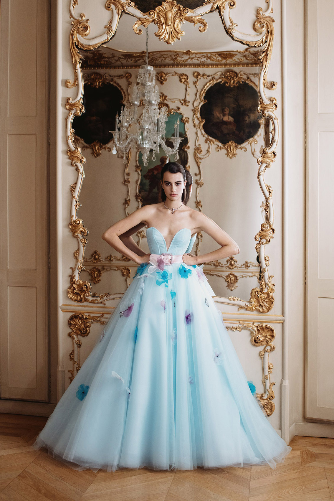 Đặc biệt nhất có thể kể đến là mẫu đầm dạ hội công chúa màu xanh thiên thanh, thiết kế cúp ngực sâu gợi cảm được đính kết hoa 3D công phu đến từ thương hiệu lừng danh Monique Lhuillier chắc chắn sẽ biến giấc mơ công chúa của mọi cô gái thành sự thật.