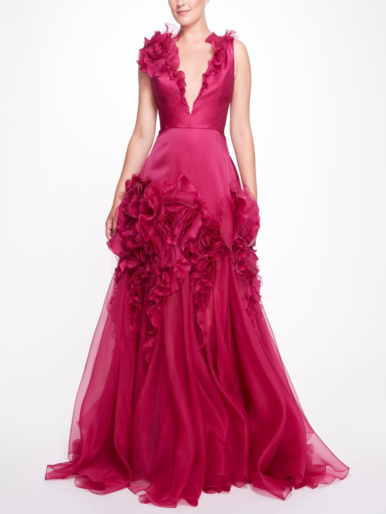 Phiên bản đầm cocktail màu hồng ngọt ngào với điểm nhấn dún bèo hoa trễ vai từ Marchesa chắc chắc là một gợi ý mà bạn không nên bỏ lỡ trong mùa xuân hè 2022.