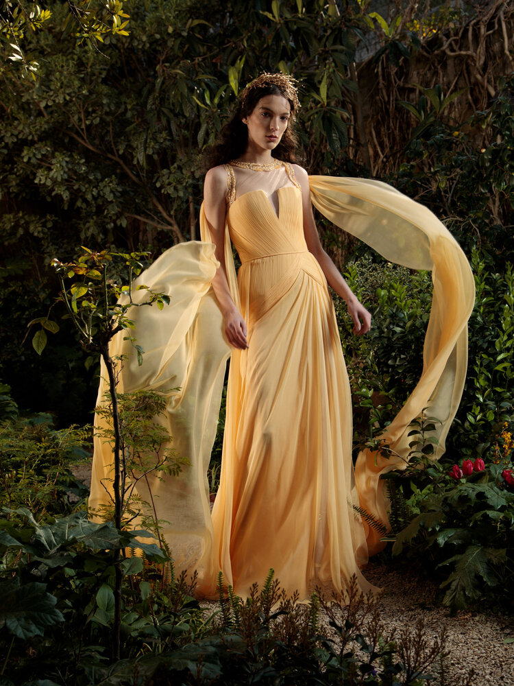 Đầm dạ hội phong cách nữ thần chào đón năm mới 2022 với gam màu vàng nghệ đầy ấn tượng. Mẫu thiết kế nằm trong BST Couture xuân hè 2022 của nhà mốt Georges Chakra đẹp tựa như những vệt nắng xuân ấm áp, với chi tiết xếp li nhuyễn tôn vinh vóc dáng nuột nà cùng tay áo choàng cape thướt tha bay bổng.