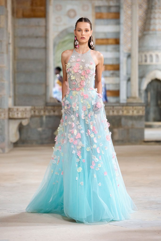 Đầm màu xanh thiên thanh là một trong những xu hướng mới được lăng xê nhiệt tình trong năm 2022. Nhà mốt Georges Hobeika đã mang đến cho các tiểu thư sành điệu một thiết kế xuyên thấu đầy quyến rũ, màu áo xanh thanh tân điểm xuyết những bông hoa đủ sắc màu đính kết công phu trên toàn thân váy.