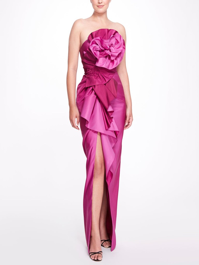 Bạn là một cô nàng sành điệu ưa thích sự phá cách? Hãy tham khảo mẫu váy đi tiệc màu hồng đậm ấn tượng nằm trong BST Resort 2022 của nhà Marchesa: dáng váy ôm suôn xẻ tà cao sẽ giúp bạn khoe khéo vóc dáng nuột nà, điểm nhấn nổi bật là phần cúp áo được dún bèo khéo léo tạo hiệu ứng bông hoa oversize đang nở rực rỡ.