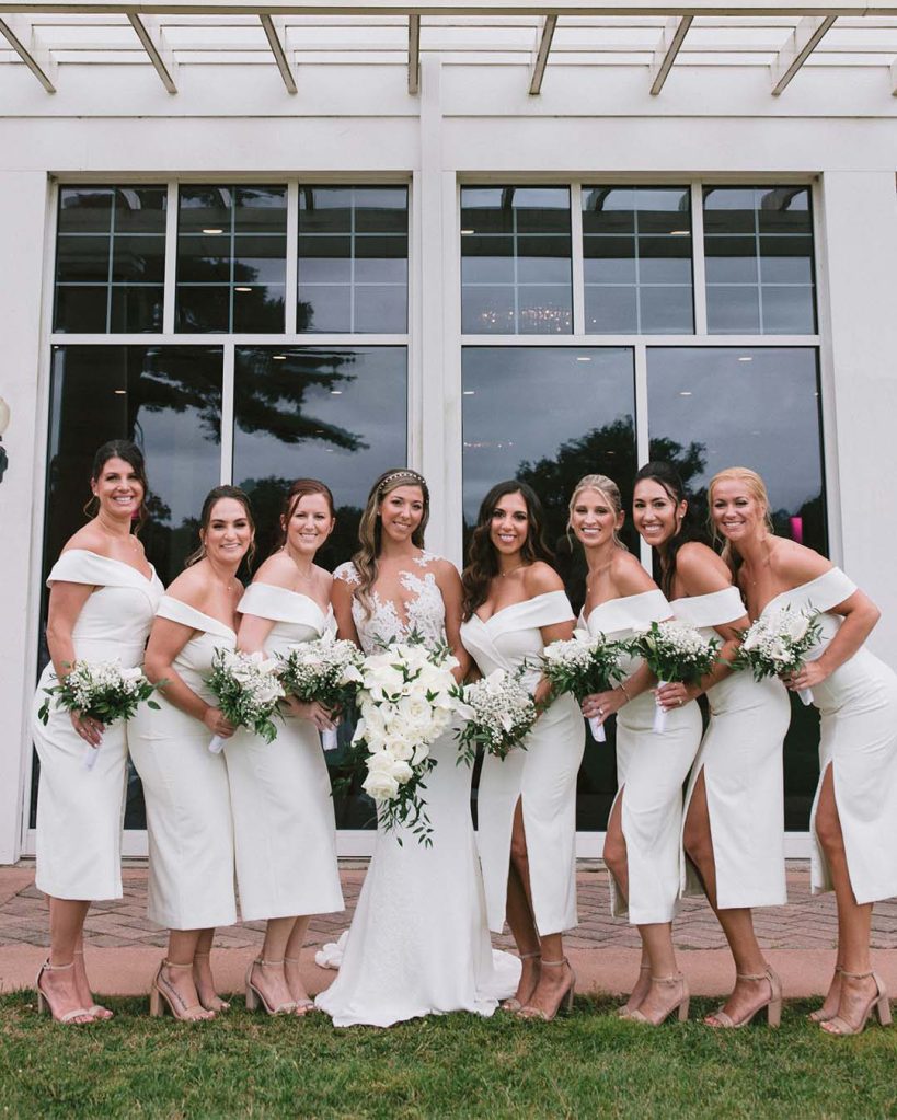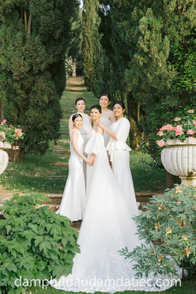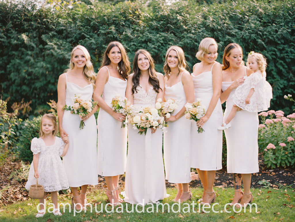 Với những cô dâu yêu thích sự tinh khôi và không sợ đụng hàng váy màu trắng, còn gì hoàn hảo bằng khi dàn phụ dâu thân thiết của bạn cũng diện lên người những chiếc đầm phù dâu màu trắng ivory tuyệt đẹp. Để tổng thể thêm phần phá cách và là một món quà cho hội chị em sau cưới, bạn cũng có thể biến tấu kiểu dáng váy cùng các chi tiết như đầm cổ cao, đầm lệch vai, đầm cổ chữ V hay đầm cúp ngực,… tất cả đều góp phần tạo nên điểm nhấn đặc biệt cho đám cưới của bạn.