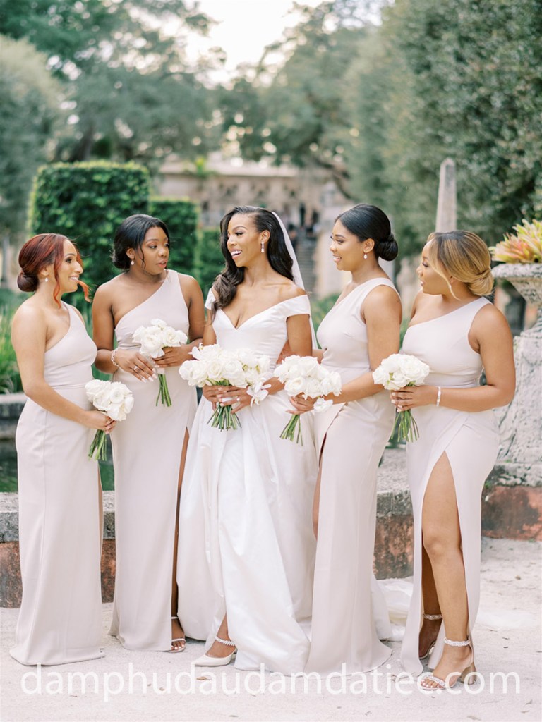 Đầm phù dâu màu beige cũng là một trong những lựa chọn tuyệt vời và không bao giờ lỗi mốt, đặc biệt thiết kế tối giản với kiểu váy ôm suôn tôn dáng càng thêm cá tính với cổ áo lệch vai cùng đường xẻ tà khoe chân gợi cảm.