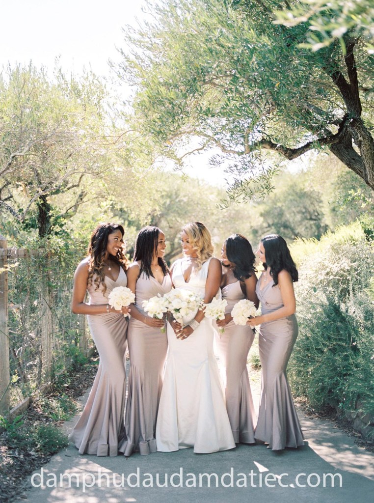 Ngoài ra, đầm phù dâu màu nâu với các sắc độ như nâu đất, xám nâu, nâu nhạt,… cũng là một trong những xu hướng đầm dự tiệc cưới được quan tâm trong năm nay. Mẫu đầm phù dâu màu nâu xám với dáng váy đuôi cá dễ dàng làm nổi bật