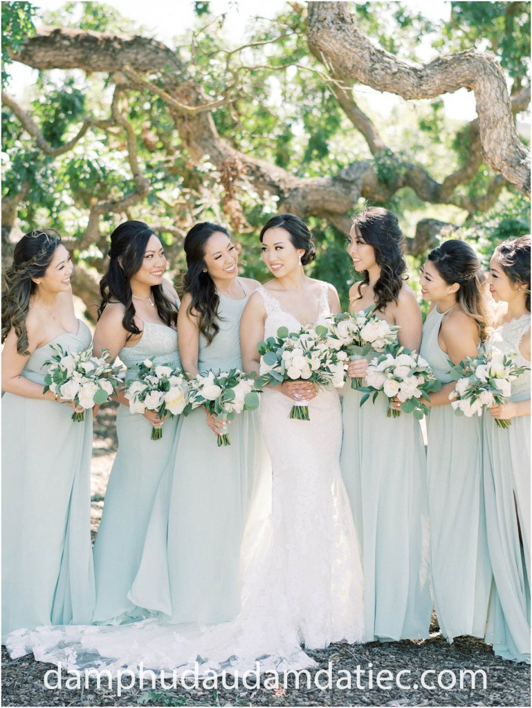 Đồng bộ và giản đơn, những chiếc váy phụ dâu màu xanh da trời có dáng đuôi cá lụa là ôm sát cơ thể quyến rũ, đồng thời tạo nên cảm giác thanh lịch nhẹ nhàng cho dàn phụ dâu và giúp cô dâu thêm phần nổi bật.