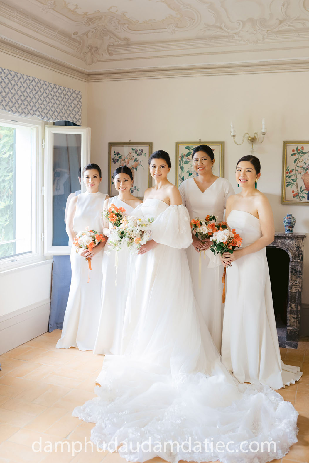 Với những cô dâu yêu thích sự tinh khôi và không sợ đụng hàng váy màu trắng, còn gì hoàn hảo bằng khi dàn phụ dâu thân thiết của bạn cũng diện lên người những chiếc đầm phù dâu màu trắng ivory tuyệt đẹp. Để tổng thể thêm phần phá cách và là một món quà cho hội chị em sau cưới, bạn cũng có thể biến tấu kiểu dáng váy cùng các chi tiết như đầm cổ cao, đầm lệch vai, đầm cổ chữ V hay đầm cúp ngực,… tất cả đều góp phần tạo nên điểm nhấn đặc biệt cho đám cưới của bạn.