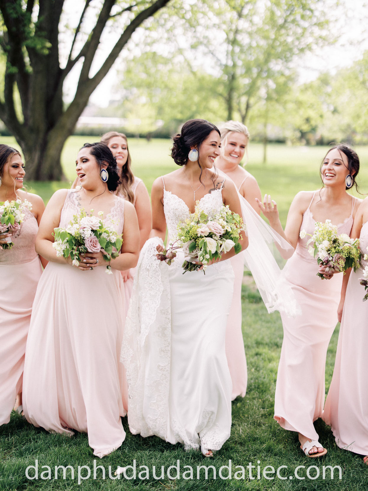 Dẫn đầu xu hướng đầm phù dâu 2022 chắc chắn là những mẫu váy phụ dâu màu hồng pastel ngọt ngào – sắc màu luôn được ưa chuộng trong mọi đám cưới và chưa bao giờ lỗi mốt. Giữa không gian sân vườn xanh mát, những chiếc váy màu hồng hệt như những cánh hoa xinh đẹp làm nổi bật vẻ đẹp tinh khôi của cô dâu. Màu hồng pastel phù hợp cho mọi kiểu dáng, bạn có thể phối hợp đa dạng váy chữ A, váy đuôi cá hay váy ôm suôn phối ren để thêm phần nữ tính nhé.