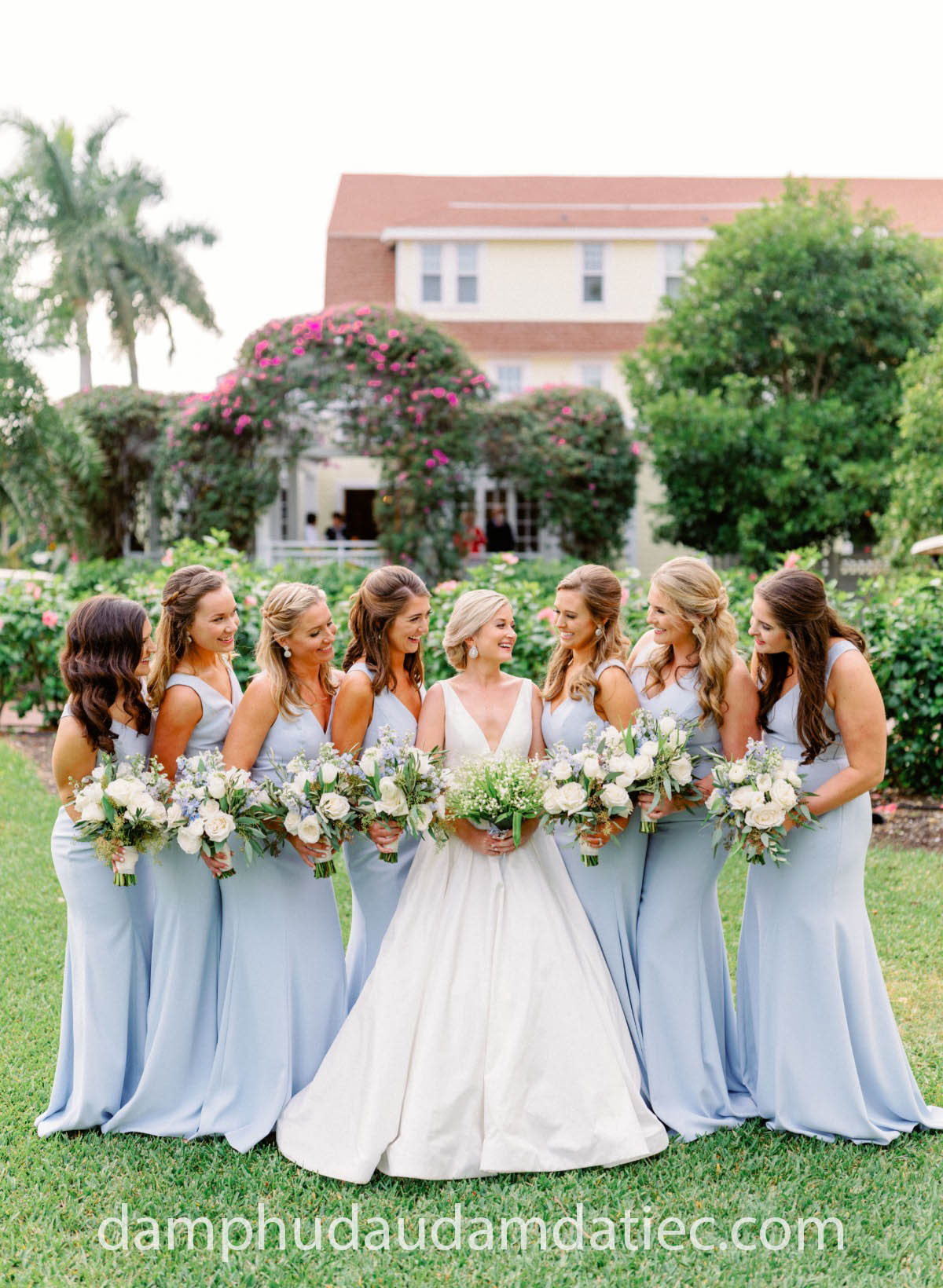 Đồng bộ và giản đơn, những chiếc váy phụ dâu màu xanh da trời có dáng đuôi cá lụa là ôm sát cơ thể quyến rũ, đồng thời tạo nên cảm giác thanh lịch nhẹ nhàng cho dàn phụ dâu và giúp cô dâu thêm phần nổi bật.