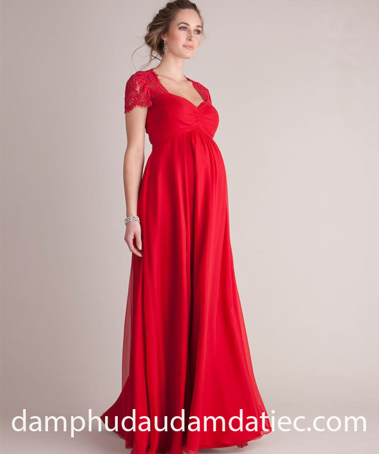 Meera Meera gợi ý mẫu đầm dạ hội cho mẹ bầu lý tưởng là phom dáng suôn nhẹ nhàng, thực hiện trên các chất liệu mỏng nhẹ. Đầm đi tiệc voan màu đỏ rực rỡ, tay ngắn phối ren với đường eo cao xếp li tinh tế giúp vùng bụng trở nên nhẹ nhàng là lựa chọn hoàn hảo giúp bạn trông vừa nổi bật, lại rất thoải mái trong việc di chuyển.