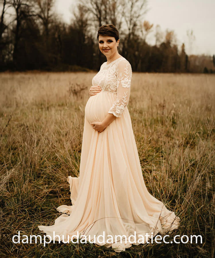 Với những buổi tiệc cưới đòi hỏi sự trang trọng, các bạn có thể chọn kiểu đầm dạ hội tay lỡ cho mẹ bầu với phom váy chữ A xoè nhẹ nhàng trên nền lụa mượt mà, cổ áo tròn cùng tay lỡ bán xuyên thấu điểm ren mang đến sự sang trọng và quý phái, đồng thời rất thoải mái và phù hợp với hầu hết các chủ đề đám cưới.