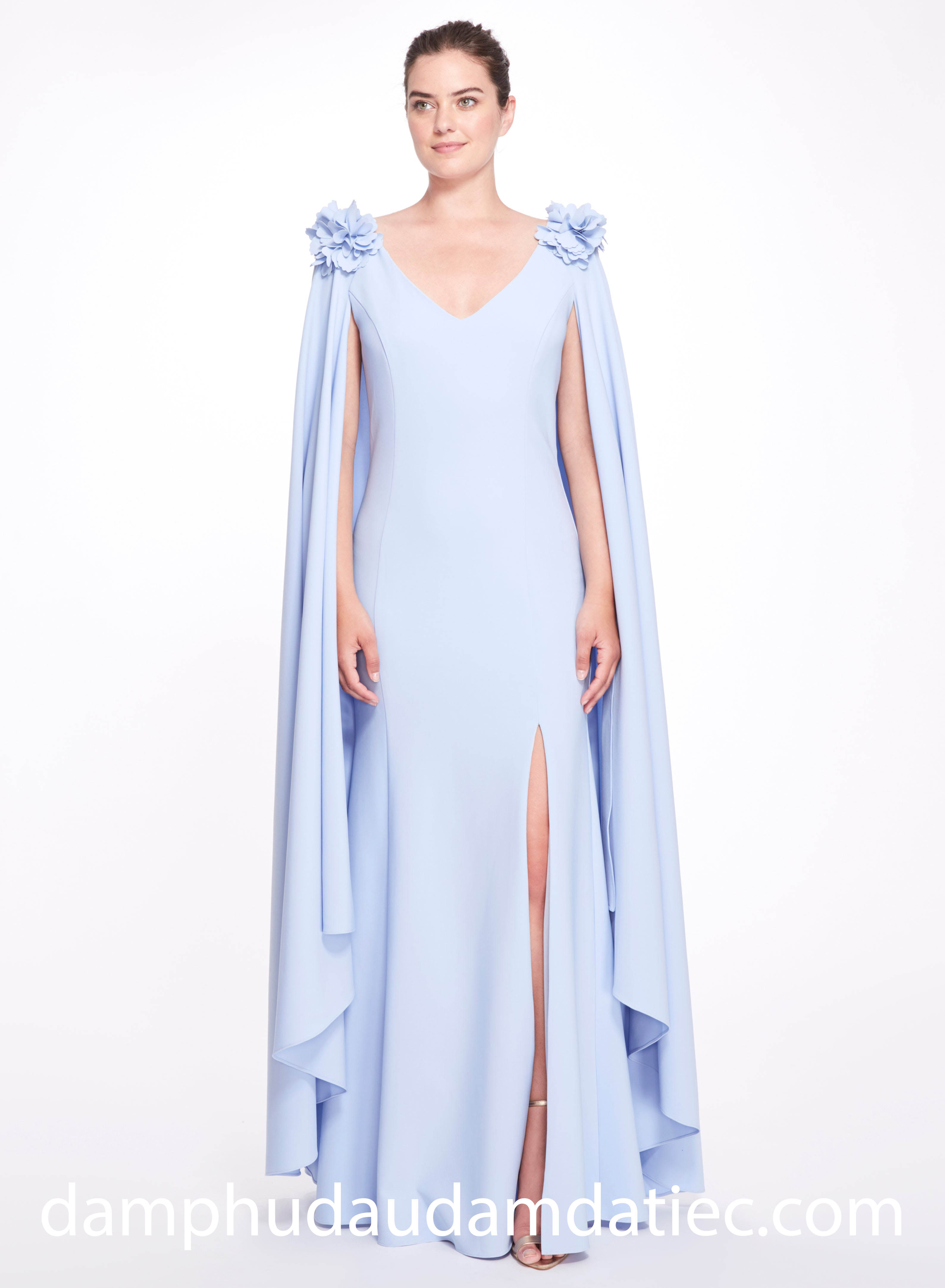 Hình tượng một nữ thần thanh lịch được khắc hoạ rõ nét trong mẫu đầm dạ hội dự tiệc cưới nhà Marchesa: xuất hiện đầy trang trọng với dáng váy ôm trọn đường cong cơ thể có tay áo choàng cape quý phái, cầu vai đính hoa 3D cùng chi tiết xẻ ngực V vừa phải và đường xẻ tà khoe chân mang đến nét gợi cảm tinh tế cho bộ trang phục.