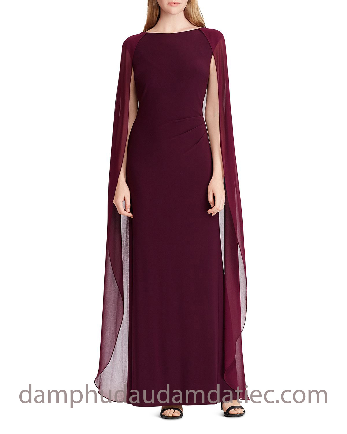 Đầm dạ hội dự tiệc sang trọng đến từ thương hiệu Ralph Lauren, với kiểu váy nữ thần tôn dáng có cổ thuyền cao trang trọng, phối cùng áo choàng cape trên tone màu đỏ rượu vang sẽ mang đến sự quý phái cho các khách mời trung niên.