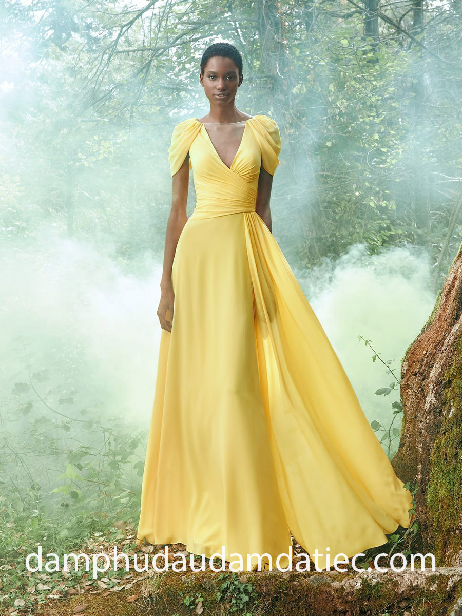 Đầm dự tiệc cưới phong cách nữ thần thích hợp với những buổi tiệc cưới có quy mô hoành tráng, sang trọng. Pronovias giới thiệu đến các quý cô mẫu đầm dạ hội màu vàng nổi bật, phom dáng suôn nhẹ nhàng với điểm nhấn cầu vai cùng những đường xếp li tinh tế tạo nên hình ảnh một nữ thần thanh tao trong đêm tiệc.