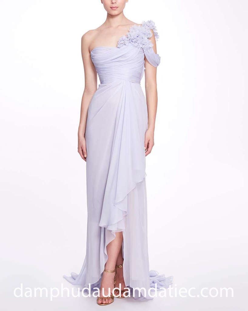 Bạn cũng có thể xuất hiện dịu dàng trong đêm tiệc cưới với mẫu đầm dự tiệc lệch vai đến từ nhà mốt Marchesa. Dáng váy ôm suôn thực hiện trên chất liệu voan bay bổng với những đường xếp li uyển chuyển cùng điểm nhấn lệch vai dún bèo hoàn thiện vẻ đẹp của một nữ thần Hy Lạp.