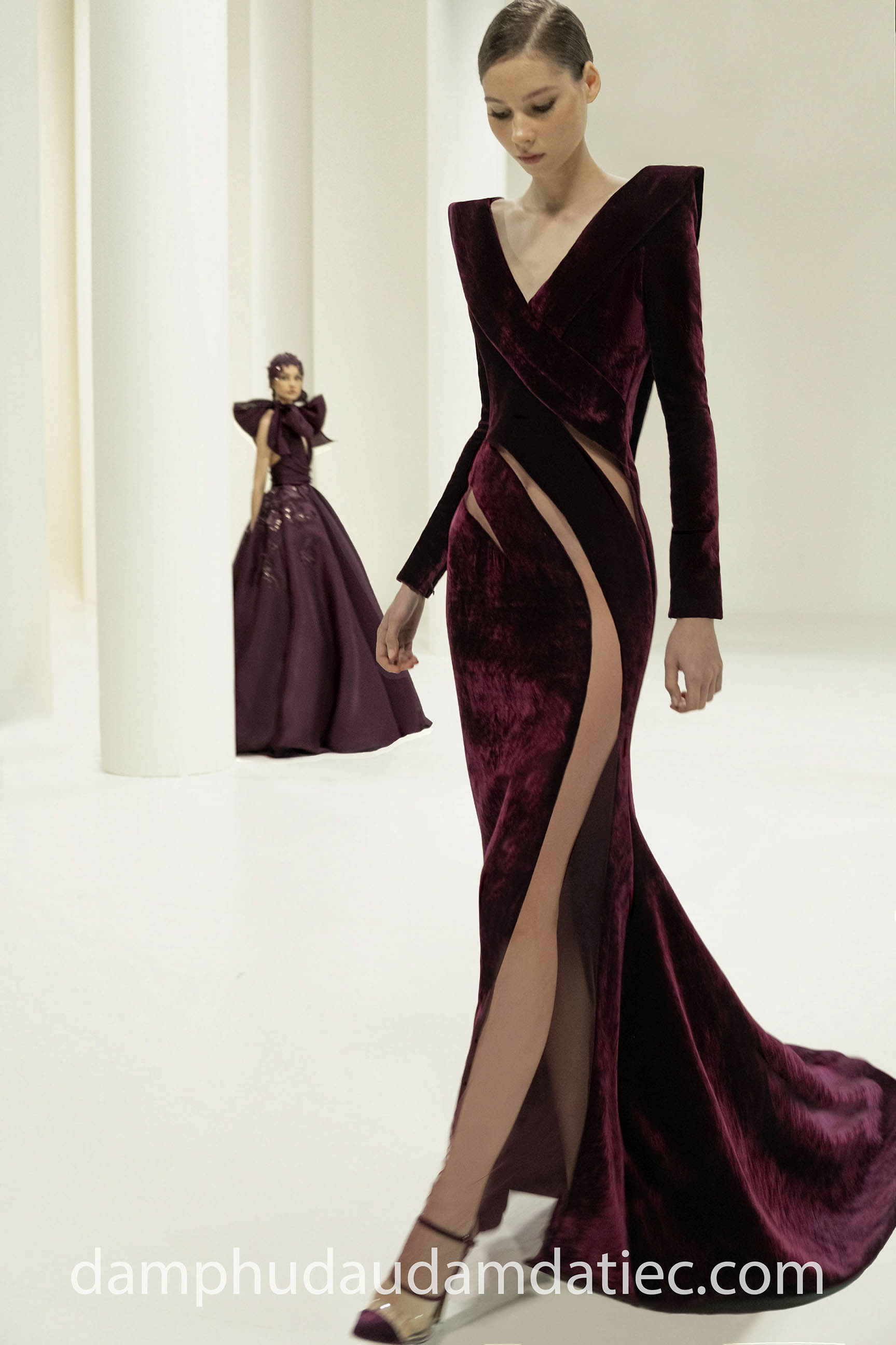 Đặc biệt, khi tham dự tiệc cưới của các fashionista sành điệu và thoải mái trong phong cách ăn mặc, bạn hoàn toàn có thể diện lên người mẫu đầm cưới dự tiệc xẻ tà cao sexy. Thiết kế ấn tượng đến từ nhà mốt lừng danh Elie Saab sẽ giúp bạn tôn dáng hoàn hảo trên nền vải nhung màu mận chín, tay dài độn vai quyền lực cùng những đường cut-out đầy táo bạo, rất phù hợp với những đêm tiệc party sang chảnh của các quý cô thời thượng.