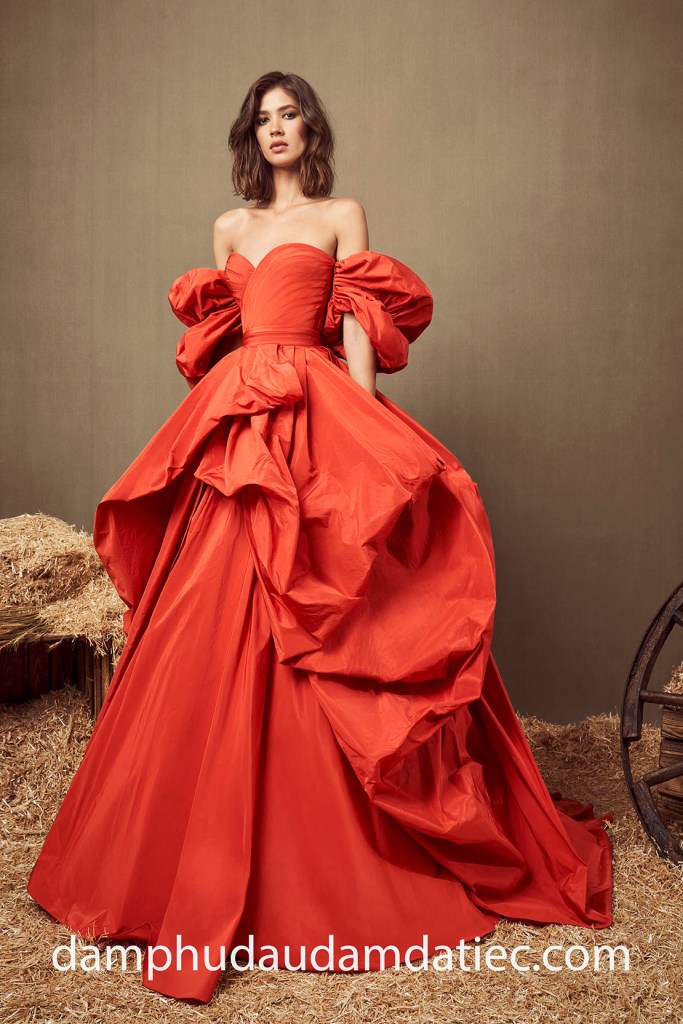 Những cô nàng thời thượng mong ước trở thành công chúa cũng sẽ phải xiêu lòng trước bộ cánh mãn nhãn này từ Zuhair Murad. Xuất hiện đầy cuốn hút với thiết kế đầm dạ hội ấn tượng, nàng công chúa thế hệ mới phá cách với kiểu đầm xếp tầng phồng lạ mắt, kết hợp cùng tay áo phồng hợp thời trang sẽ giúp bạn càn quét mọi thảm đỏ.