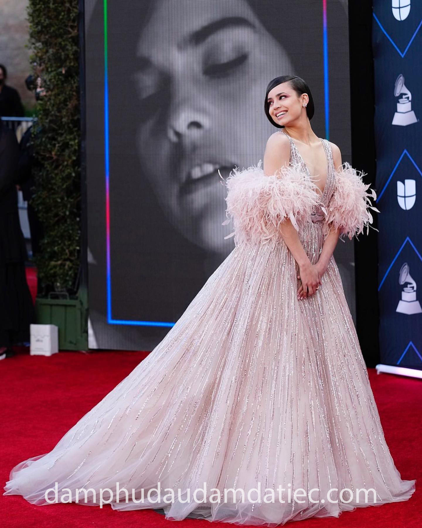 Trong khi đó, nữ ca sĩ Sofia Carson khiến công chúng choáng ngợp trong bộ cánh công chúa đính lông vũ điệu đà, cổ áo xẻ ngực sâu sexy cùng tùng váy xoè lộng lẫy được đính kết kỳ công.