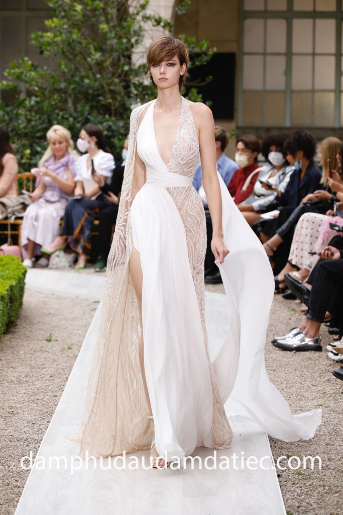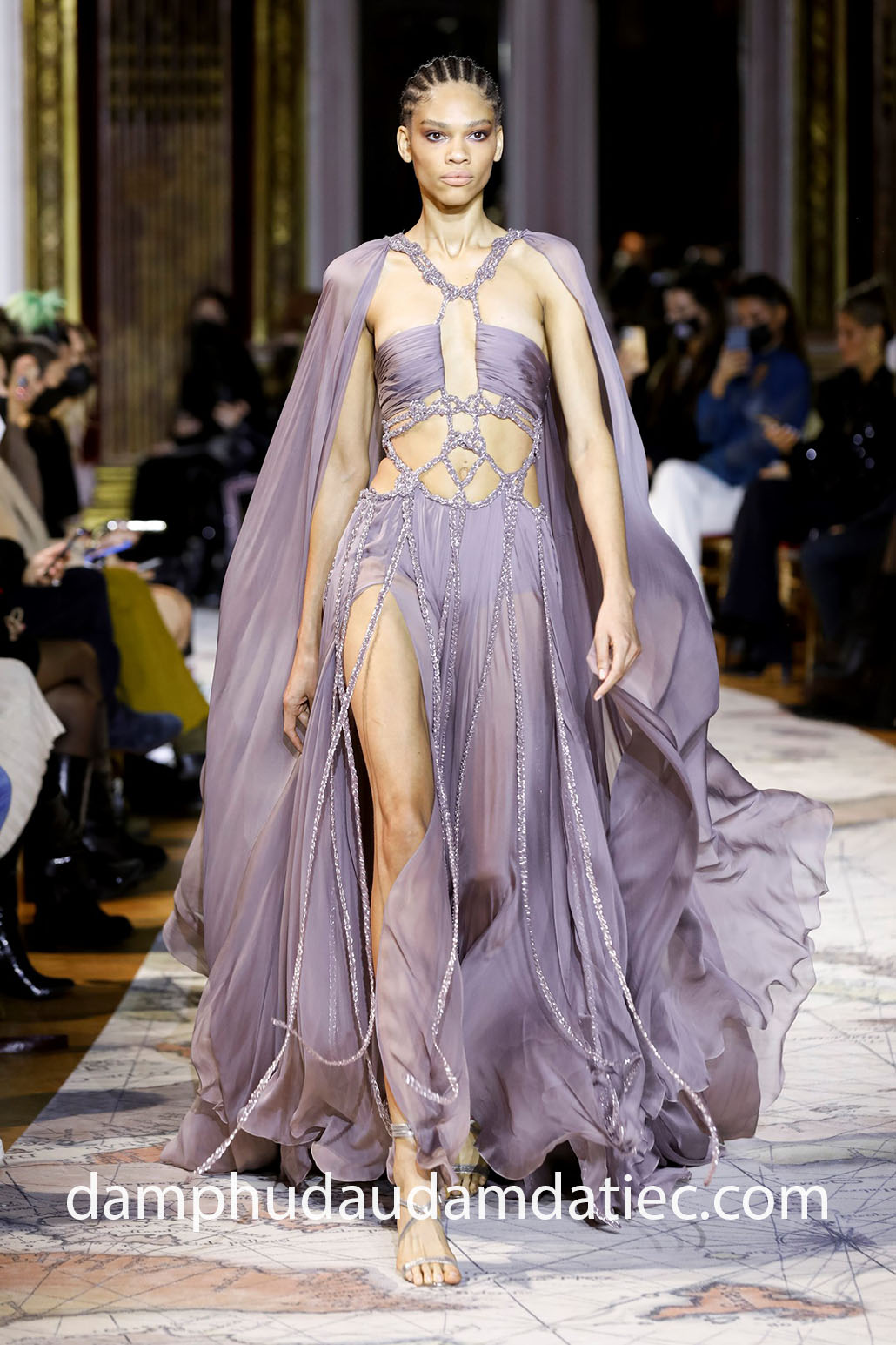 Xu hướng đầm dạ hội Haute Couture 2022 của nhà mốt Zuhair Murad chú trọng vào những chất liệu bay bổng, nhẹ nhàng và thật nữ tính như lưới, voan và lụa. Mẫu thiết kế thuộc BST Couture Xuân Hè 2022 mang đến tạo hình về một nữ thần biển cả với những đường cut out đầy gợi cảm được bện từ những dây lưới đánh cá lấp lánh, phối hợp cùng chất vải voan tung bay như những cơn gió biển dạt dào.