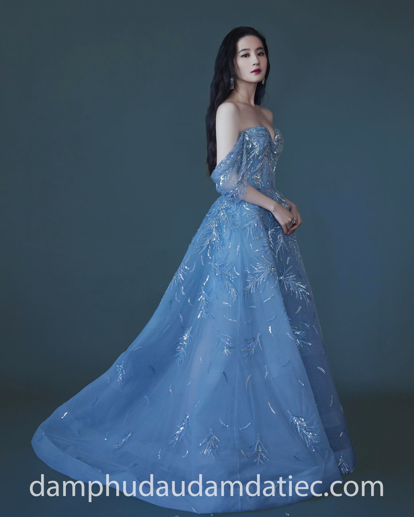 Trong khi đó, ‘thần tiên tỉ tỉ’ Lưu Diệc Phi lại gây thương nhớ khi khoác lên người mẫu đầm dạ hội trễ vai màu xanh huyền ảo. Chi tiết trang trí tinh xảo, vừa bắt sáng mà lại thanh tao góp phần tôn vinh khí chất thần tiên của ngọc nữ hàng đầu làng giải trí Hoa ngữ.
