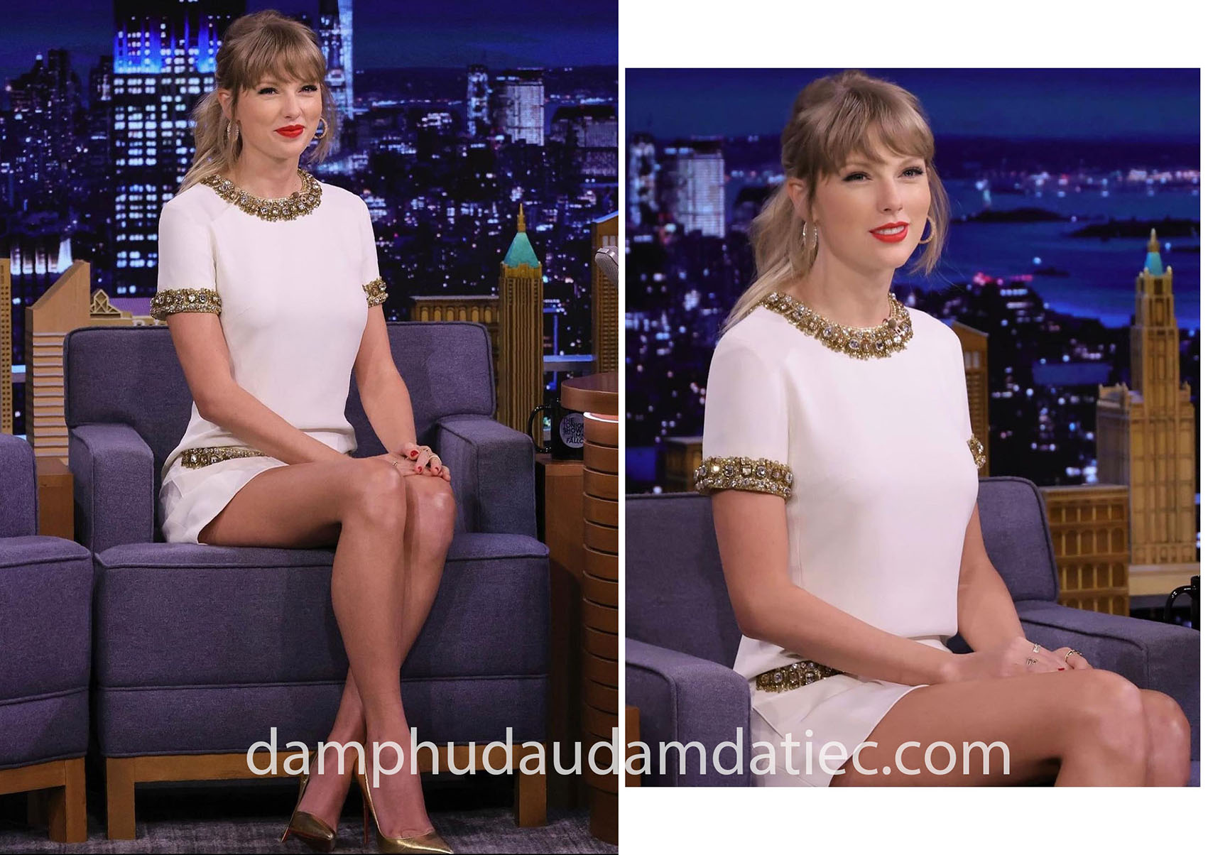 ‘Công chúa nhạc đồng quê’ – ca sĩ Taylor Swift xuất hiện nền nả khi lên sóng truyền hình trong mẫu đầm đi tiệc ngắn Zuhair Murad. Dáng váy mini dress màu trắng trang nhã càng thêm nổi bật với chi tiết đính kết ở cổ, tay áo,… tỉ mỉ và bắt sáng lấp lánh.