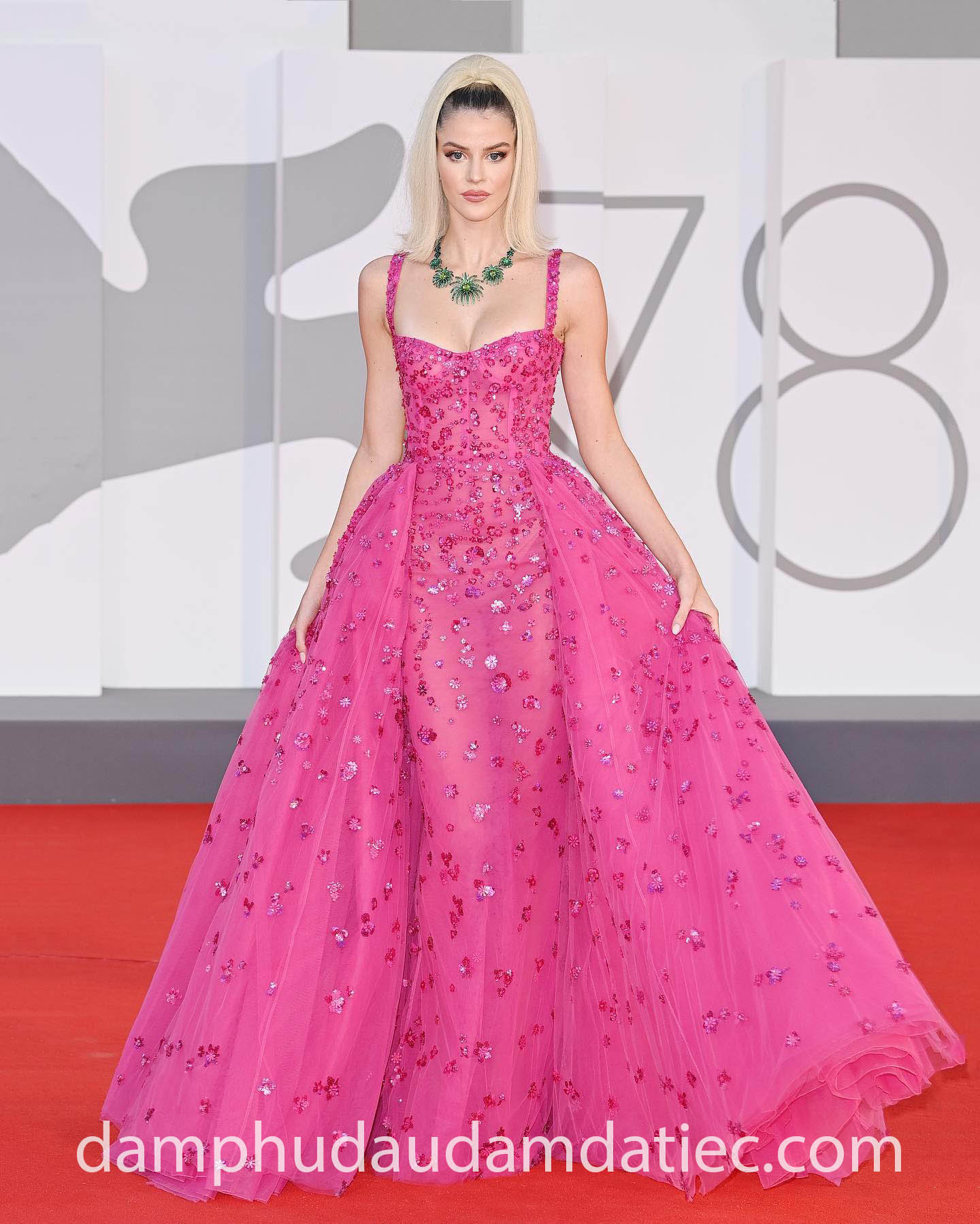 Mỹ nhân Sara Croce xuất hiện xinh xắn như búp bê Barbie trong bộ váy dạ hội công chúa màu hồng của Zuhair Murad. Thiết kế ấn tượng với kiểu đầm hai dây bán xuyên thấu đầy gợi cảm, kết hợp cùng tùng váy rời được đính kết bắt mắt.