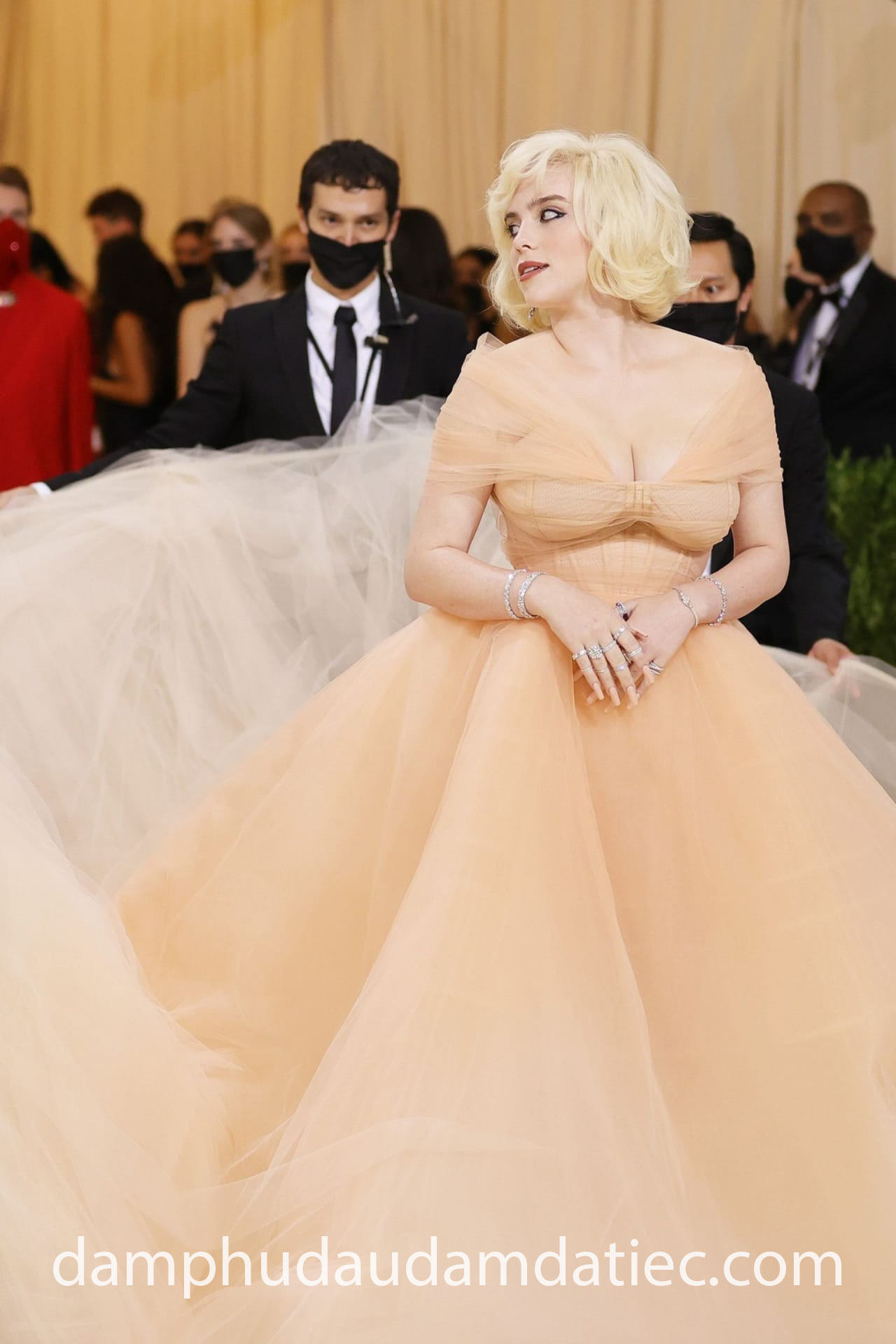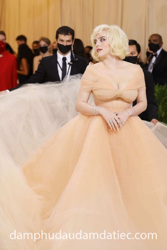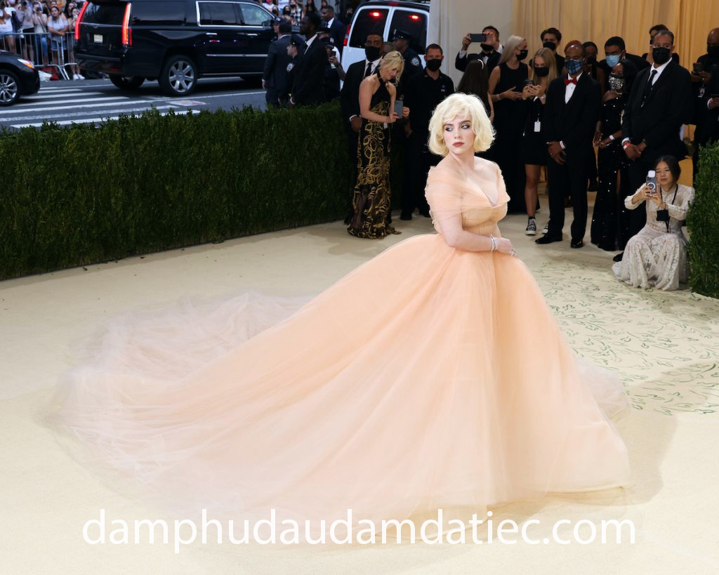 Khoảnh khắc nữ ca sĩ Billie Eilish xuất hiện trong bộ đầm dạ hội công chúa tại sự kiện Met Gala chắc chắn là một trong những tâm điểm nổi bật nhất làng thời trang. Mẫu thiết kế vô cùng lộng lẫy đến từ thương hiệu lừng danh Oscar de la Renta đã giúp nữ ca sĩ khoe trọn lợi thế vòng một khủng với thân áo corset siết chặt eo thon, đẩy vòng một tràn đầy hấp dẫn cùng tay áo trễ vai quý phái khắc hoạ trọn vẹn hình tượng minh tinh Marilyn Monroe.
