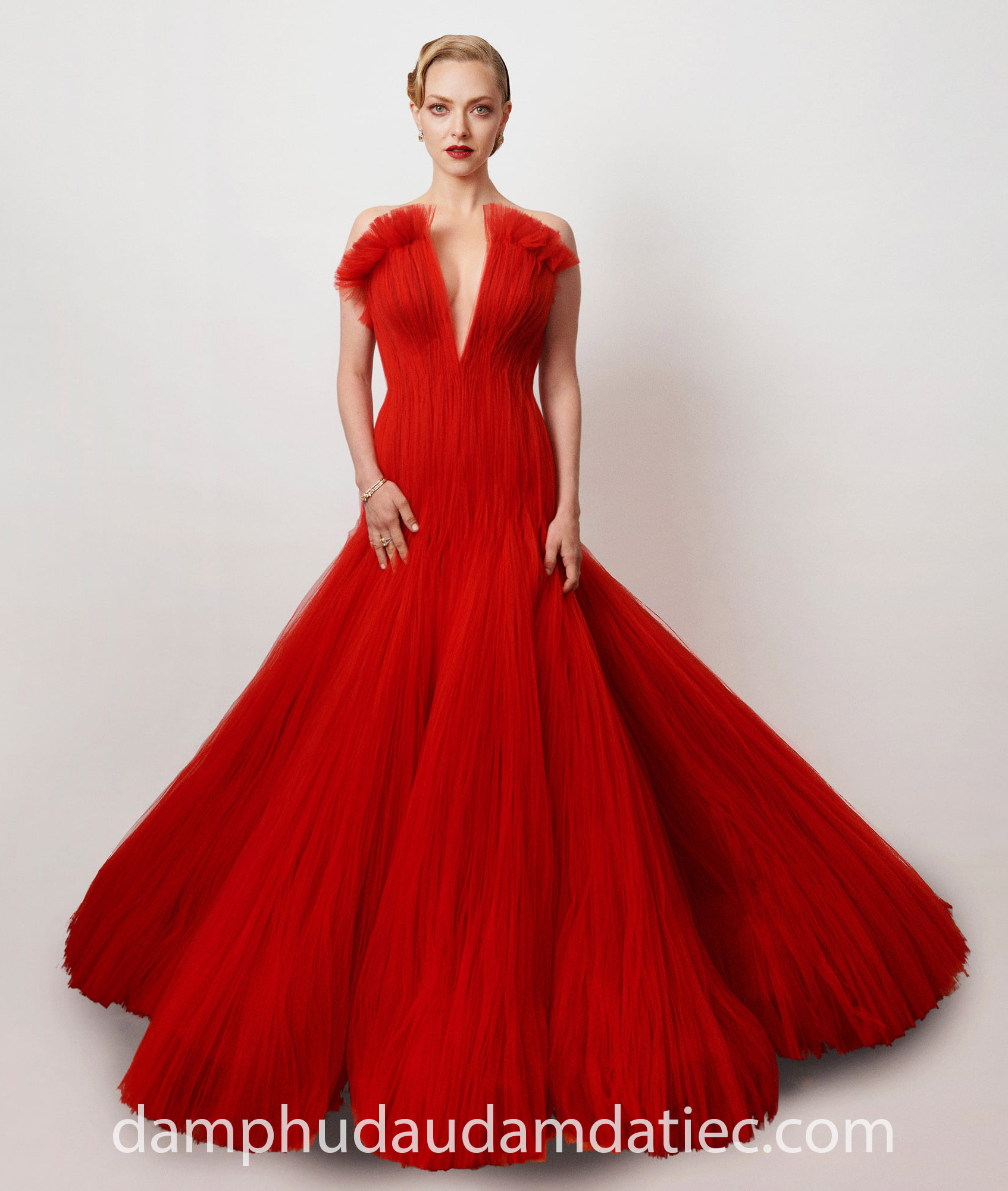 Minh tinh nổi tiếng Hollywood – Amanda Seyfried thiêu đốt mọi ánh nhìn tại lễ trao giải Oscars với mẫu đầm dạ hội Haute Couture đến từ Armani Privé. Tone màu đỏ hút mắt làm nổi bật làn da trắng sứ của nữ diễn viên với thiết kế cúp ngực xẻ V sâu khoe vòng một lấp ló, phom váy fit-and-flare gây chú ý bởi những đường xếp li công phu lộng lẫy.