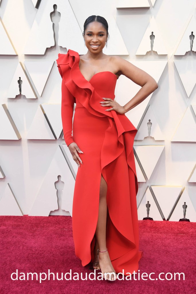 Trong một mùa Oscars khác, Jennifer Hudson trở nên thanh lịch và gợi cảm với mẫu đầm đi tiệc Haute Couture có thiết kế bất đối xứng trên tone màu đỏ san hô hút mắt từ thương hiệu Elie Saab lừng danh.