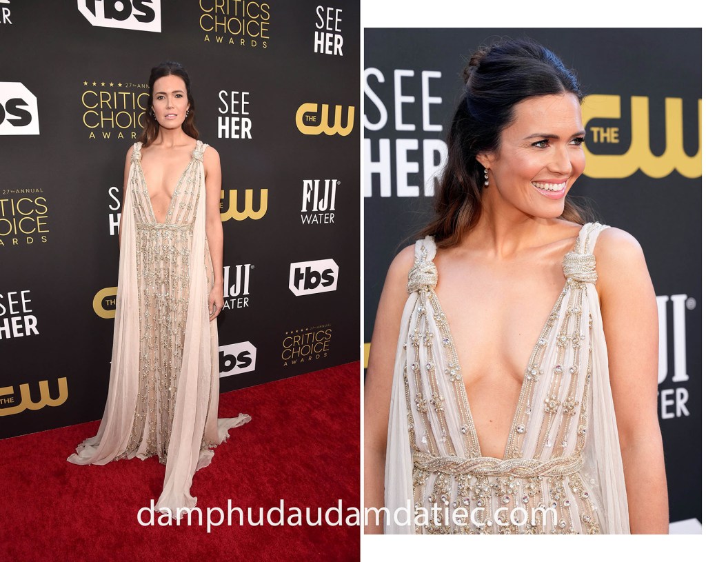 Nữ diễn viên nổi tiếng Mandy Moore khoe trọn vòng một trong chiếc đầm dạ hội Haute Couture của Elie Saab tại lễ trao giải Critics Choice Awards. Mẫu thiết kế gợi nhắc đến hình tượng những nữ thần Hy Lạp gợi cảm với dáng váy suôn nhẹ có cổ xẻ V sâu hoắm sexy được đính kết vô cùng công phu.