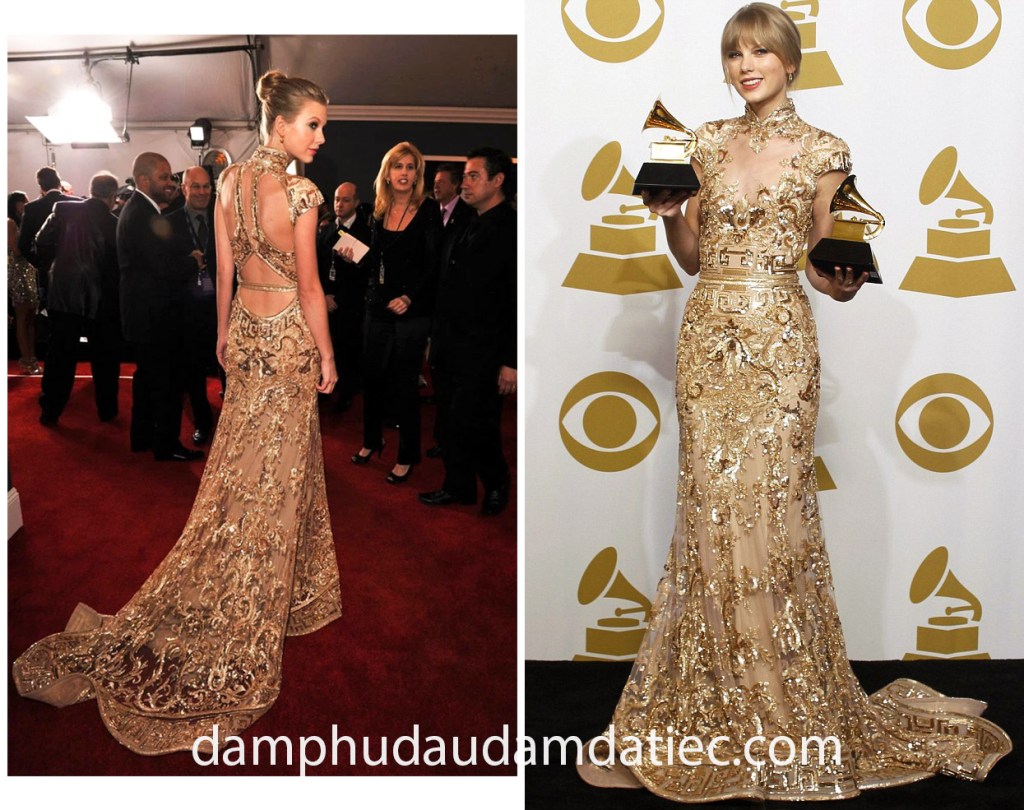 Bộ đầm dạ hội Zuhair Murad màu vàng đồng chói lọi dường như sinh ra dành riêng cho Taylor Swift để cô nàng ẵm trên tay 2 bức tượng kèn vàng Grammys danh giá. Xuất hiện không khác gì một nữ thần, bộ cánh Haute Couture rất phù hợp với vóc dáng thanh mảnh của Taylor, đồng thời tạo nên hiệu ứng thị giác vô cùng ấn tượng khiến bất kỳ ai cũng phải xuýt xoa khen ngợi.