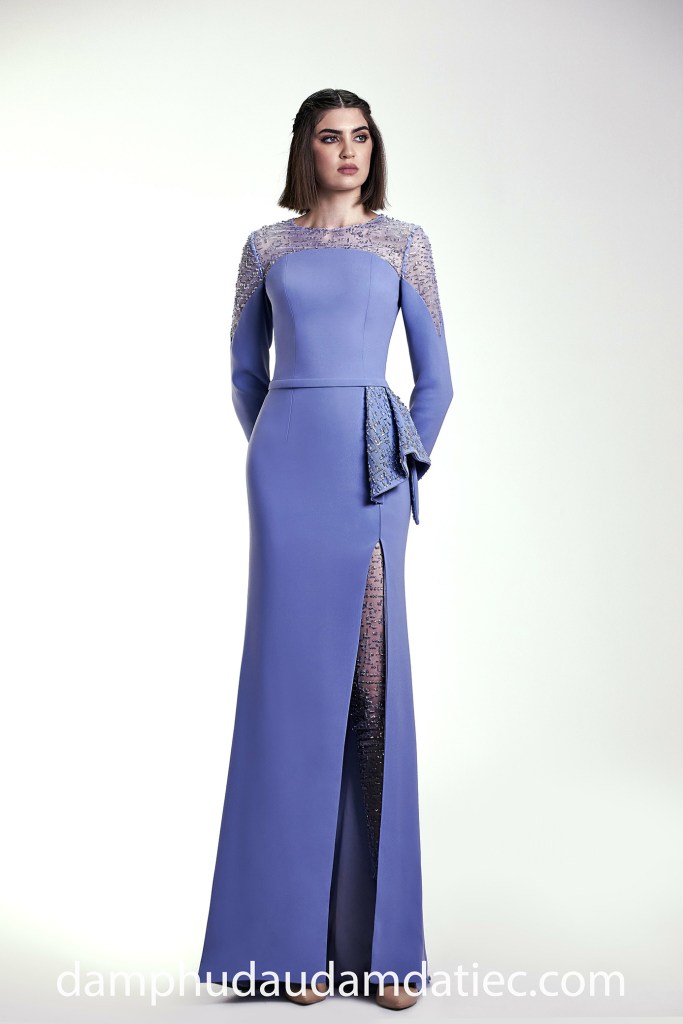 Với những cô gái ưa thích phom váy tôn dáng, mẫu đầm dự tiệc cho người ngực nhỏ của Apollo Couture sẽ giúp bạn khắc phục vòng ngực khiêm tốn với cúp áo cắt cong tạo hiệu ứng căng đầy, đi cùng tay áo dài trang trí tỉ mỉ. Chân váy ôm gọn body có điểm nhấn eo tinh tế và đường xẻ tà khoe đôi chân lấp lánh.