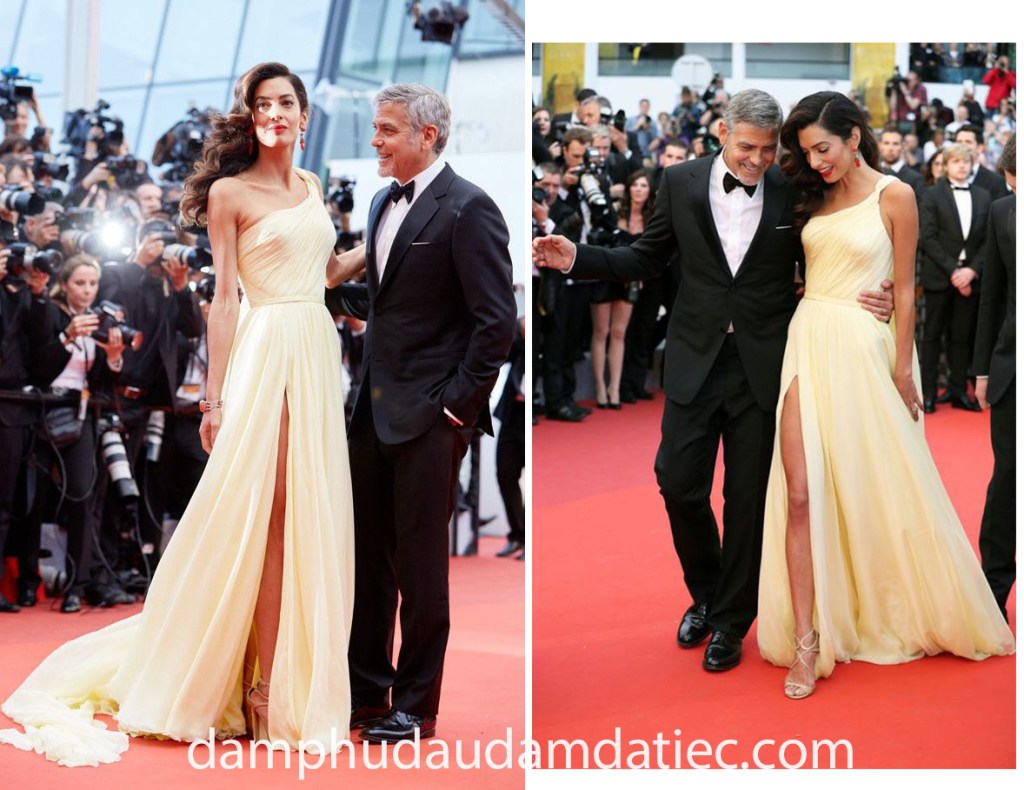Mỹ nhân ‘mình hạc xương mai’ Amal Clooney đẹp tựa nữ thần khi diện lên người mẫu đầm dự tiệc thảm đỏ từ thương hiệu Atelier Versace. Thiết kế đơn giản nhẹ nhàng với dáng váy chữ A suôn, kết hợp những đường xếp li tinh tế cùng cổ áo lệch vai tạo hiệu ứng đầy đặn cho vòng một, đi cùng tùng váy xoè bay bổng khoe chân nuột nà.