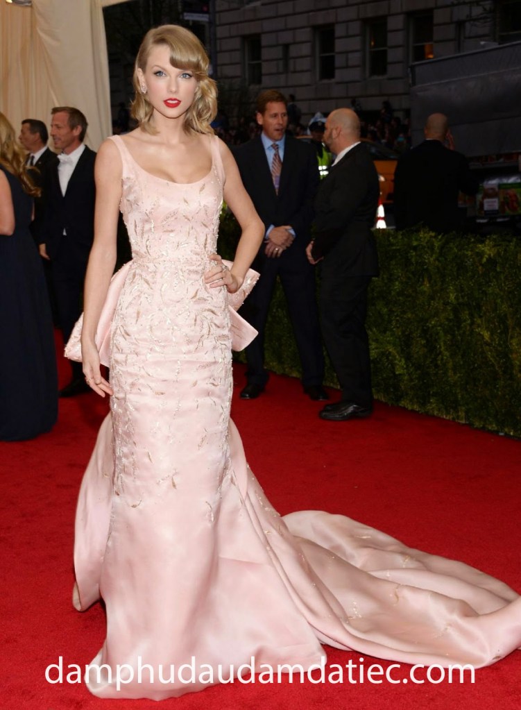 Tại thảm đỏ Met Gala, Taylor Swift mang đến hình ảnh vừa gợi cảm lại vừa sang trọng trong mẫu đầm dạ hội Oscar de la Renta. Thiết kế tuyệt mỹ có cúp ngực khoét cong khoe vòng một nhỏ xinh lấp ló, dáng váy ôm suôn trang trí kỳ công trên tone màu hồng pastel quý phái, đi cùng đuôi nơ oversize tạo điểm nhấn ấn tượng khó quên.