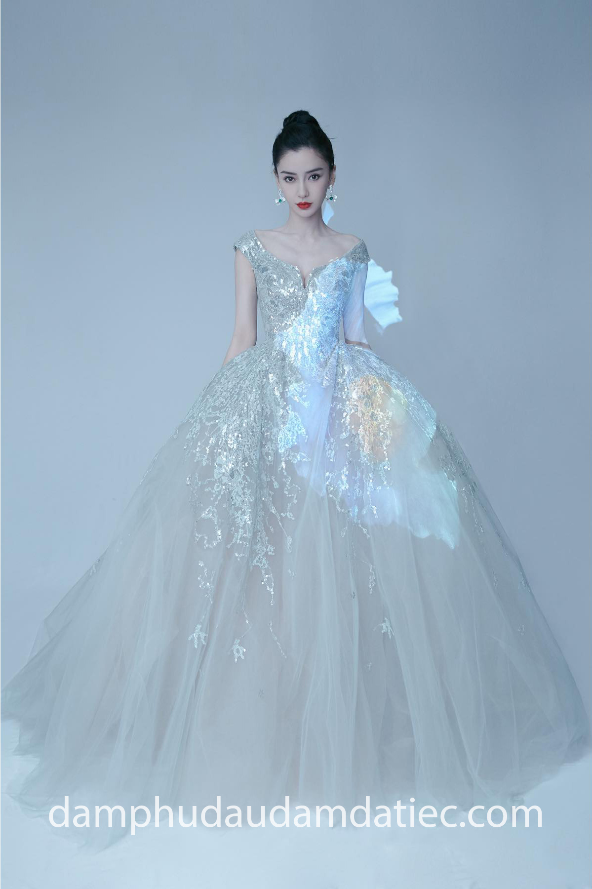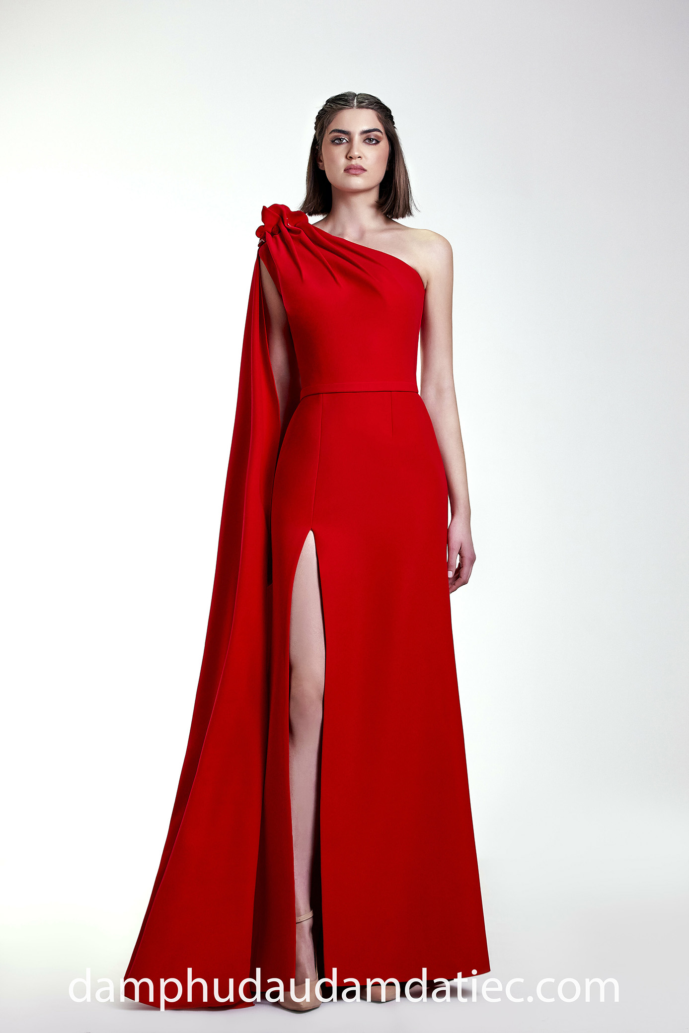 Thêm một gợi ý đầm dạ hội đẹp cho người ngực lép từ Apollo Couture với dáng váy ôm suôn lệch vai, đánh lạc hướng sự chú ý vào vòng ngực lép cùng tà áo dài mang đến hình ảnh nữ thần gợi cảm, khoe chân thẳng tắp với đường xẻ tà cao sexy.