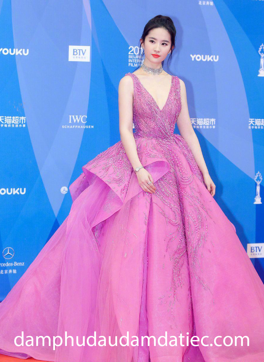 “Thần tiên tỷ tỷ” Lưu Diệc Phi khiến công chúng choáng ngợp khi diện lên người bộ đầm dạ hội cổ tích từ nhà mốt Zuhair Murad. Thiết kế tạo hiệu ứng “gây mê” với tone màu hồng vô cùng ngọt ngào có cổ áo xẻ V khoe vòm ngực trắng nõn nà, đi cùng tùng váy xếp tầng xoè hoành tráng được trang hoàng hoạ tiết đính kết kỳ công.