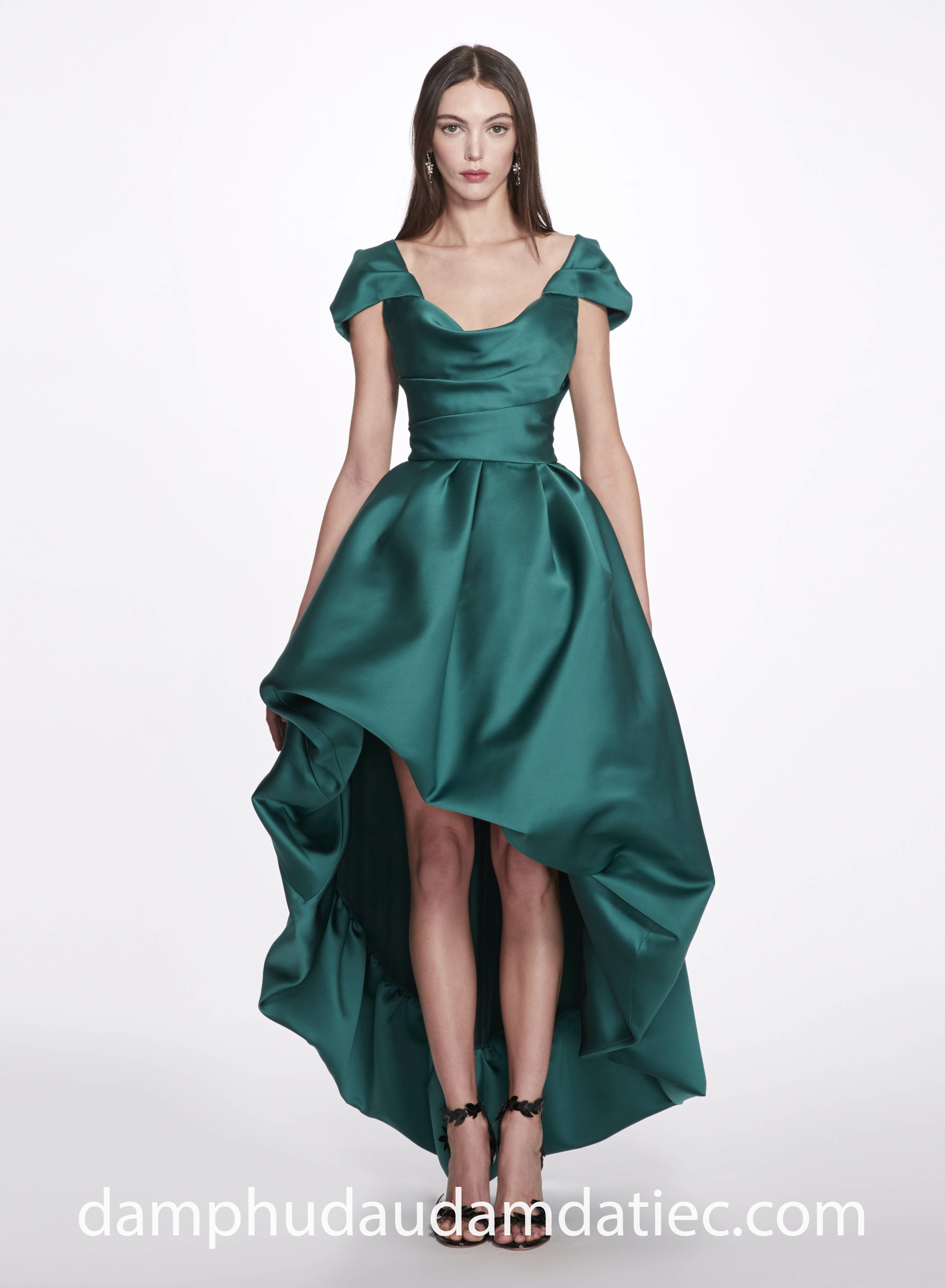 Bạn cũng có thể phá cách với mẫu đầm đi tiệc high low cho người ngực nhỏ từ thương hiệu Marchesa. Tạo hình ấn tượng với thân áo xếp nếp bẹt vai giúp cân đối thân trên, đi cùng chân váy bồng ‘trước ngắn sau dài’ thực hiện trên chất vải satin đứng phom, sang xịn.