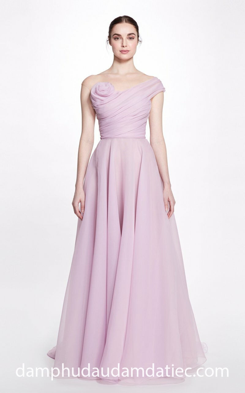 Xuất hiện với phom dáng đầm dự tiệc chữ A dễ mặc đẹp, Marchesa vô cùng tinh tế khi ứng dụng kỹ thuật tạo hình bằng vải xếp li, giúp vòng một thêm phần đầy đặn và tăng thêm vẻ lãng mạn cho bộ trang phục đơn giản.