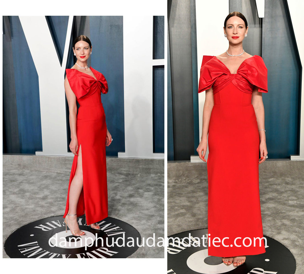 Nữ diễn viên truyền hình Caitriona Balfe khéo léo lựa chọn cho mình mẫu đầm dự tiệc cho ngực lép tại đêm tiệc Vanity Fair Oscar Party. Thiết kế nổi bật với cổ áo tạo hình nơ ấn tượng đi cùng những đường xếp li tinh tế giúp tạo điểm nhấn cho vòng một khiêm tốn, kết thúc bằng chân váy ôm suôn với toe màu đỏ thật hút mắt.