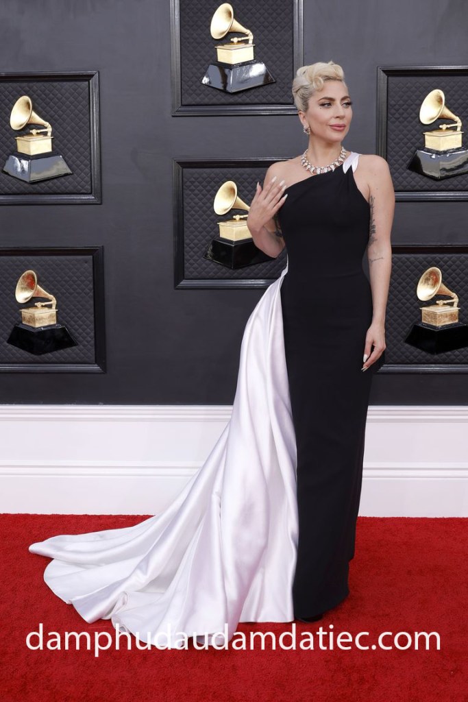 Tại lễ trao giải Grammy 2022, nữ ca sĩ Lady Gaga cũng có một màn trình diễn vô cùng xuất sắc. Đồng hành cùng cô là chiếc đầm dạ hội satin sang trọng đến từ nhà mốt xa xỉ Elie Saab. Mẫu váy màu xanh thiên thanh thực hiện trên chất vải satin cao cấp với những nếp gấp đầy tinh tế, ôm gọn body với chiều dài tea length rất dễ di chuyển. Thiết kế có thêm chiếc nơ oversize tạo nên điểm nhấn ngọt ngào cho bộ trang phục thanh lịch.