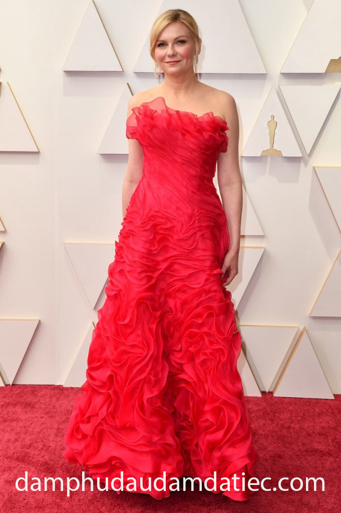 Nữ diễn viên Kirsten Dunst xuất hiện sang trọng trong mẫu đầm dạ hội màu đỏ đến từ “phù thuỷ Haute Couture” Christian Lacroix. Mẫu thiết kế thực hiện trên chất vải xếp dún bèo tầng tạo hiệu ứng hút mắt ấn tượng.