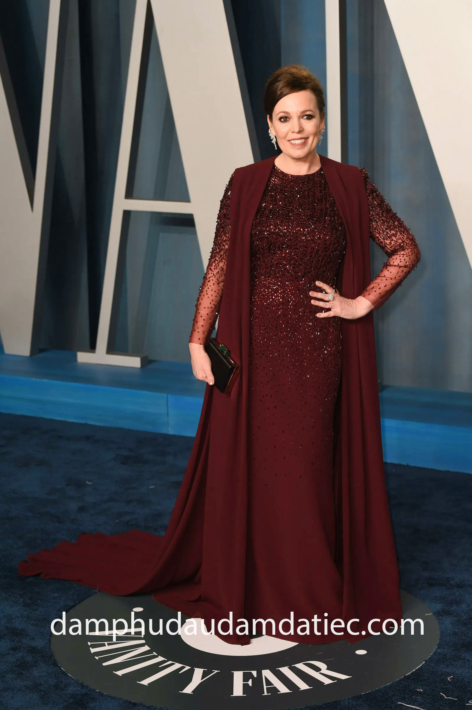 Nữ diễn viên Olivia Colman xuất hiện trang trọng tại thảm xanh Vanity Fair trong mẫu đầm dạ hội trung niên của nhà mốt Dolce & Gabbana. Mẫu thiết kế có form váy ôm suôn nhẹ nhàng thực hiện trên chất liệu lụa rũ mềm màu đỏ rượu, kết hợp kỹ thuật đính kết tinh tế, sang trọng.