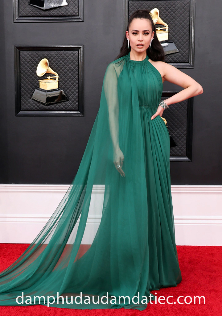Ca sĩ Sofia Carson dịu dàng trong mẫu đầm đi tiệc dự thảm đỏ đơn giản của nhà mốt Valentino. Mẫu thiết kế dáng suôn xếp li nhẹ nhàng với cổ áo yếm xếp li nhuyễn đi cùng tà áo cape dài thướt tha. Đây cũng là kiểu váy mang tính ứng dụng cao mà các cô gái cũng có thể lựa chọn để làm váy dự tiệc sang trọng vào năm 2022 này.