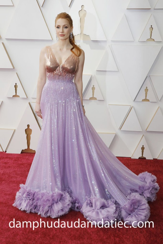 Nữ diễn viên Jessica Chastain – người đã giành được Giải Oscar 2022 cho Nữ diễn viên chính xuất sắc nhất cho màn trình diễn ấn tượng trong tác phẩm “The Eyes of Tammy Faye”, cô đã thu hút sự chú ý của công chúng trong mẫu đầm dạ hội lấp lánh màu tím pastel với phần viền dún bèo ấn tượng, khoe trọn vòng một sexy với cổ áo xẻ V sâu phối màu vàng rose gold sành điệu. Nữ diễn viên kết hợp trang phục Gucci với trang sức cao cấp cũng từ thương hiệu Gucci.