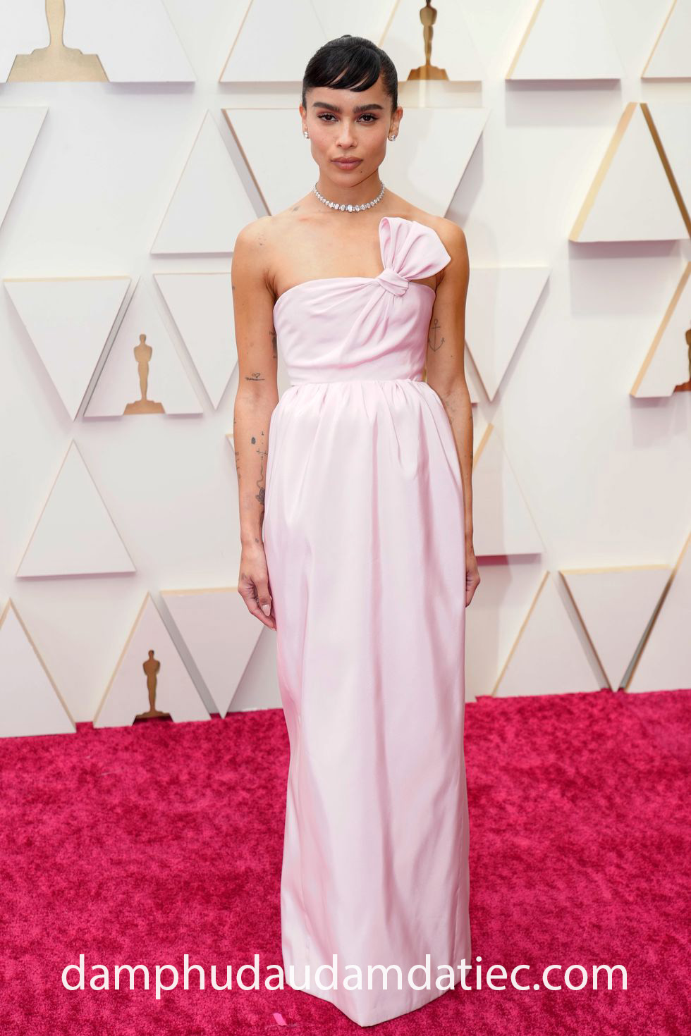 Diện lên người mẫu đầm dự tiệc thảm đỏ đơn giản từ Saint Laurent, nữ diễn viên Zoë Kravitz gợi nhớ đến hình tượng Audrey Hepburn trong chiếc váy màu hồng pastel kinh điển. Thiết kế đơn giản mà thanh tao với điểm nhấn thắt nơ lệch vai cũng đủ tạo nên sức hút to lớn không kém gì những bộ cánh lồng lộn.