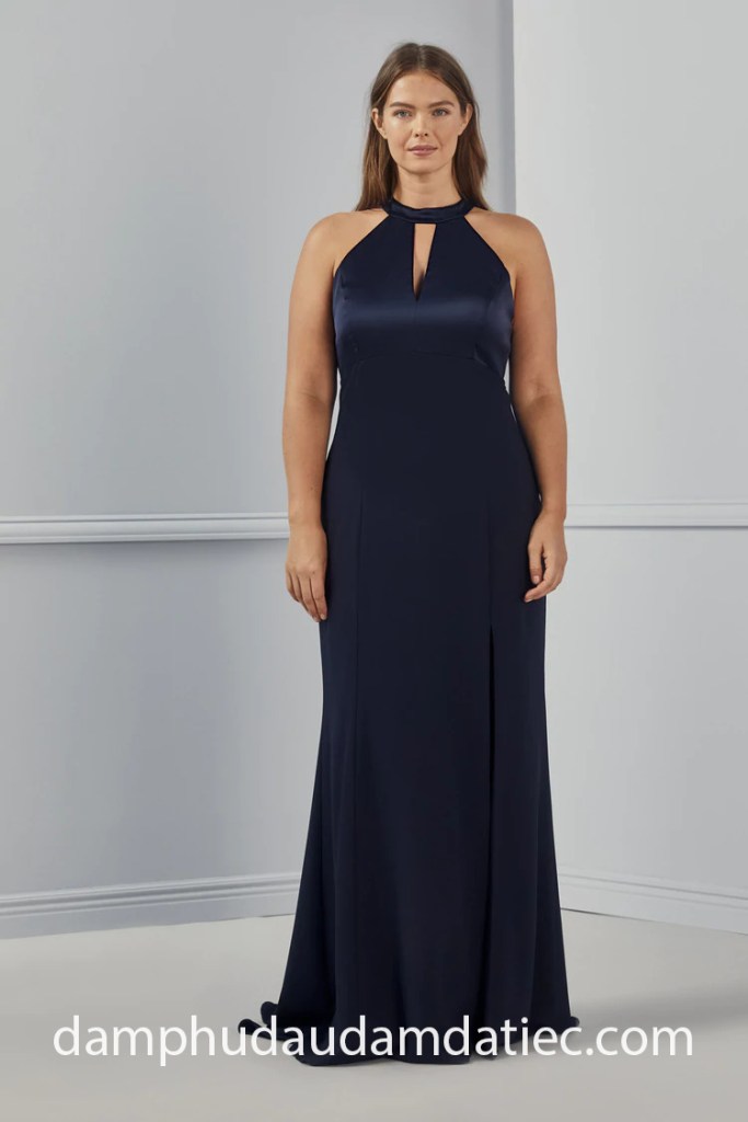Thêm một lựa chọn nữa cho bạn gái mạp mạp là mẫu đầm phù dâu big size đi biển có cổ yếm, thực hiện trên chất vải satin đứng phom sẽ cân bằng toàn bộ cơ thể, mang đến vẻ ngoài đầy gợi cảm trên tone màu xanh đen giúp bạn “giảm cân” đáng kể trong một nốt nhạc.
