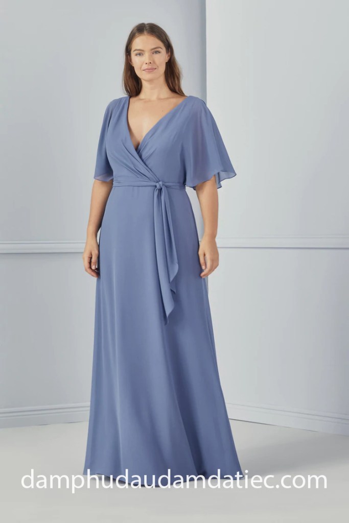 Các bạn gái mũm mĩm sẽ hoàn toàn tự tin khi diện lên người mẫu đầm phụ dâu big size tay cánh tiên của Amsale, thực hiện trên chất vải voan nhẹ nhàng vừa giúp che bớt bắp tay to lại giúp bạn thật thanh thoát trên form váy suôn nhẹ, dễ di chuyển.